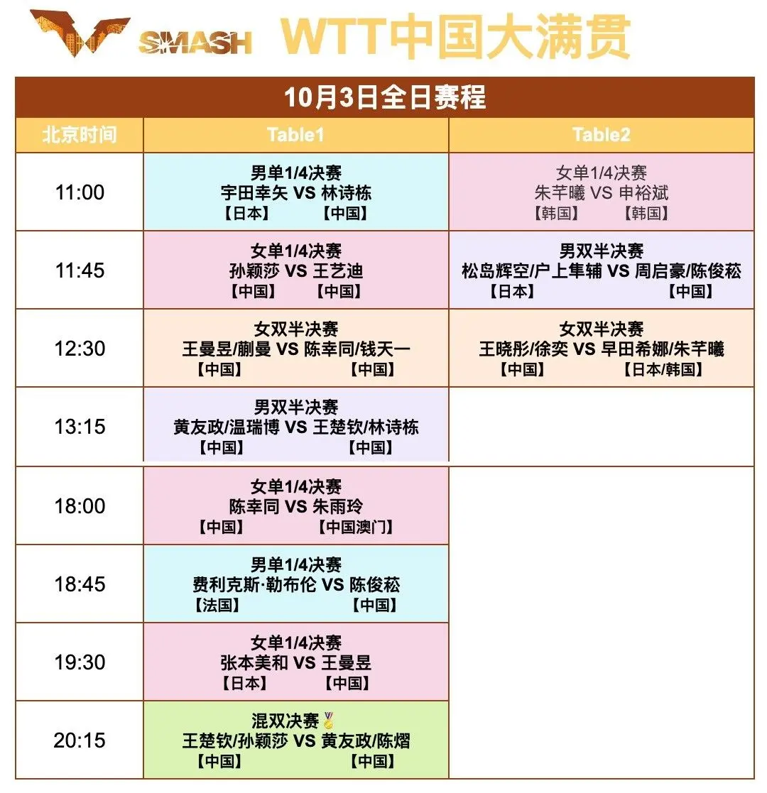 WTT中国大满贯赛,2025年10月3日央视直播的预告:cctv5频道为11:00-12:05、18:00-21:30;cctv5+频道为13:00-15:05。